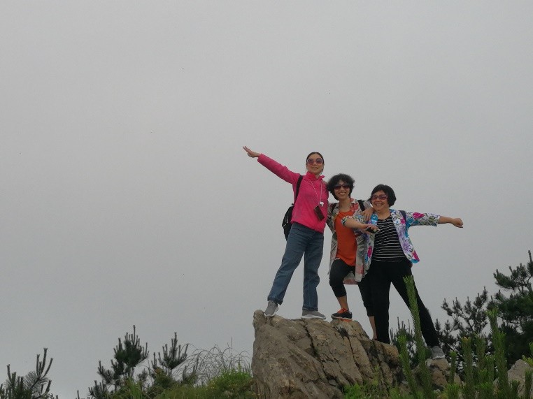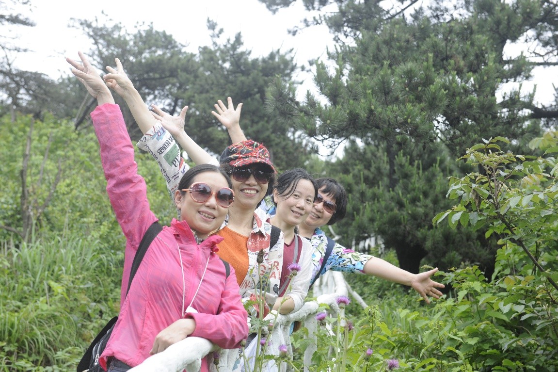 经过2个半小时车程,顺利到达双峰山森林公园。沿着蜿蜒的山路,六辆电瓶车承载着谈笑风生的可爱的老师们,抵达主峰脚下,老师们们兴致勃勃向主峰攀登。欢声笑语沿着山梁行进,愉快的气氛飘荡在幽静的山林。骄阳躲进云层,花鸟相伴左右。沿途风景秀美,不时跳出林立陡峭的怪石,忽现层叠葱郁的林木,身旁花香鸟语,碧水涌翠,美不胜收。不知不觉间,登上了主峰的回宫阁,凭栏远眺,“仙源”美景目不暇接,无限风光尽收眼底,真恰似“河流如束带,田舍若棋盘”。